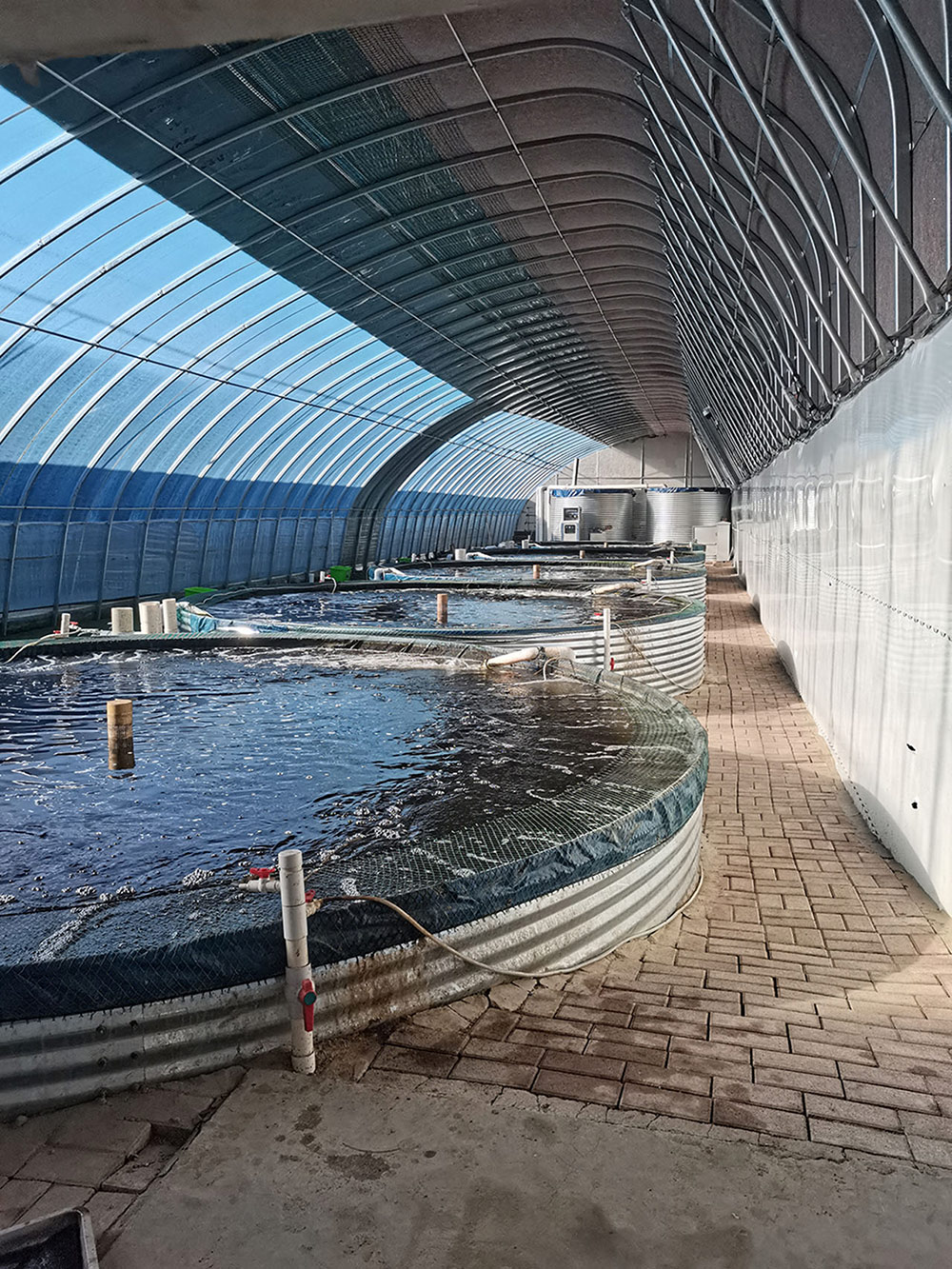 養殖區(qū)主要(yào)建設标準化(huà)養殖$β暖棚 10 座,每座大(dà)棚占地(dì)♣↕¥ 0.6 畝,內(nèi)設有(yǒu) 5 個(gè) 6 米直↔§♦徑養殖桶,每棚可(kě)養殖 27000 尾,相(x♠♦iàng)較于 傳統池塘一(yī)畝水(shuǐ)面 1500 ©↔ 斤的(de)養殖量,工(gōng)廠(chǎng)化(huà)循環水(s βhuǐ)養殖每立方 米的(de)水(shuǐ)體₽∑(tǐ)可(kě)以養 100 斤魚。就(jiù)單位面積的(de)産量而言 $,循環水(shuǐ)模式 就(jiù)比傳統魚塘提高γΩσδ(gāo)了(le) 40 幾倍。